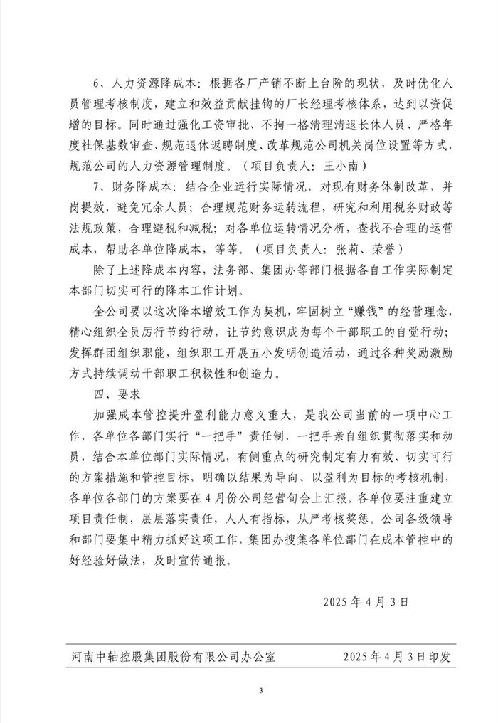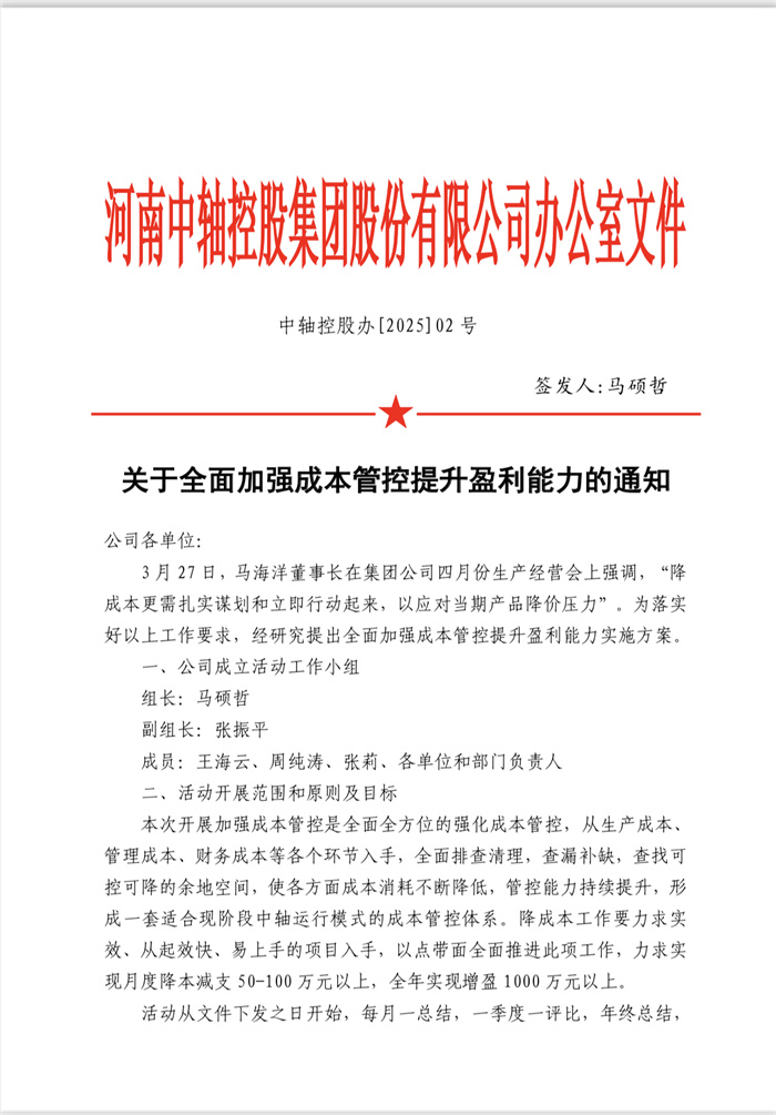 中軸控股辦【2025】02號全面實施降成本工作方案